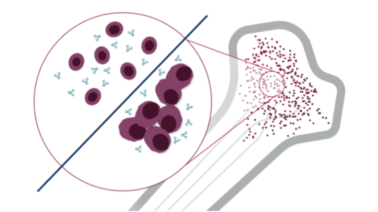 다발성 골수종(Multiple myeloma)은 흔하지는 않지만 중요한 혈액 암 종류 중 하나입니다. 다발성 골수종은 골수 내 악성 백혈구 세포가 인접한 조직이나 세포사이에 침입하여 전신적으로 뼈를 파손시키는 신생물 질환으로 '형질세포(백혈구 세포의 일종) 골수종'이라고 합니다. 치료하지 않으면 진단된 지 약 2년 내 사망하는 이 질병은 정확한 원인은 아직 알려져 있지 않으나, 유전적 요소와 환경적 요인이 관련될 수 있습니다. 또한 40세 이상에서 흔히 발생하며, 평균 발생 연령은 65세입니다. 남성이 여성의 2배 정도의 발생을 보이고 있으며, 백인보다는 흑인에서 보다 흔하게 볼 수 있습니다. 다발성 골수종은 형질세포(백혈구 세포의 일종)의 과도한 증식을 특징으로 하는 질환입니다. 형질세포는 신체를 보호하는 면역글로불린이라는 것을 생성합니다. 그러나 다발성골수종에서는 악성 백혈구세포가 골수의 인접한 조직이나 세포 사이에 침입하여 엄청난 양의 비정상 면역글로불린을 만들어 내는데 이들 비정상 면역글로불린을 골수종 단백질이라고 합니다. 골수종 단백질이 증가함에 따라 정상 백혈구세포는 감소되어 결국 신체의 정상 면역기능은 손상됩니다. 악성 백혈구세포의 증식으로 초래되는 면역글로불린과 단백물질의 과도 생성은 골수, 뼈, 신장, 비장, 림프절, 간, 심지어는 심근에까지 골수종의 영향을 미치게 됩니다.